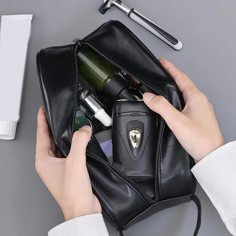 Bolsa de Aseo de Cuero para Hombre, Bolsa de Viaje para Negocios Bolsa de Cosméticos Portátil de Gran Capacidad con Diseño de Múltiples Bolsillos