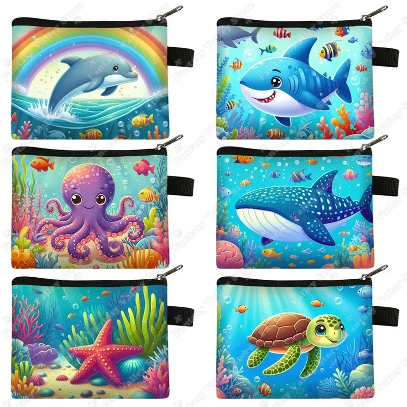 Bolsa de monedas con dibujos animados de delfines, tiburón, Tortuga, animales marinos, monedero lindo, tarjetero de crédito, billetera con cremallera