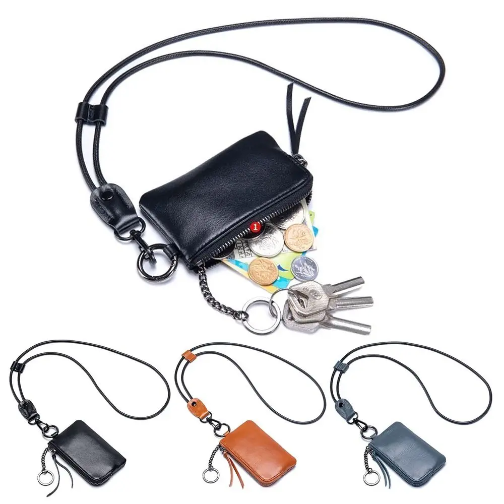 Monedero de cuero negro para hombre, mini billetera multifunción con un solo cremallera para teléfono móvil y monedas