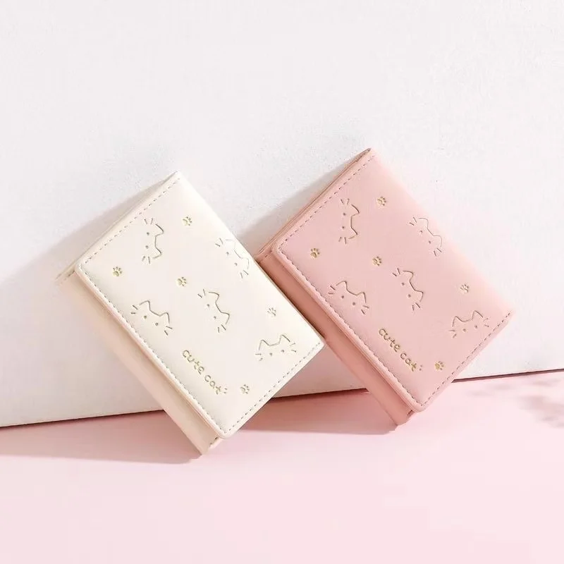 Monedero de cuero PU con bonito gato para mujer, cartera corta a la moda, billetera plegable con cremallera, tarjetero de identificación, monederos ligeros de viaje para efectivo