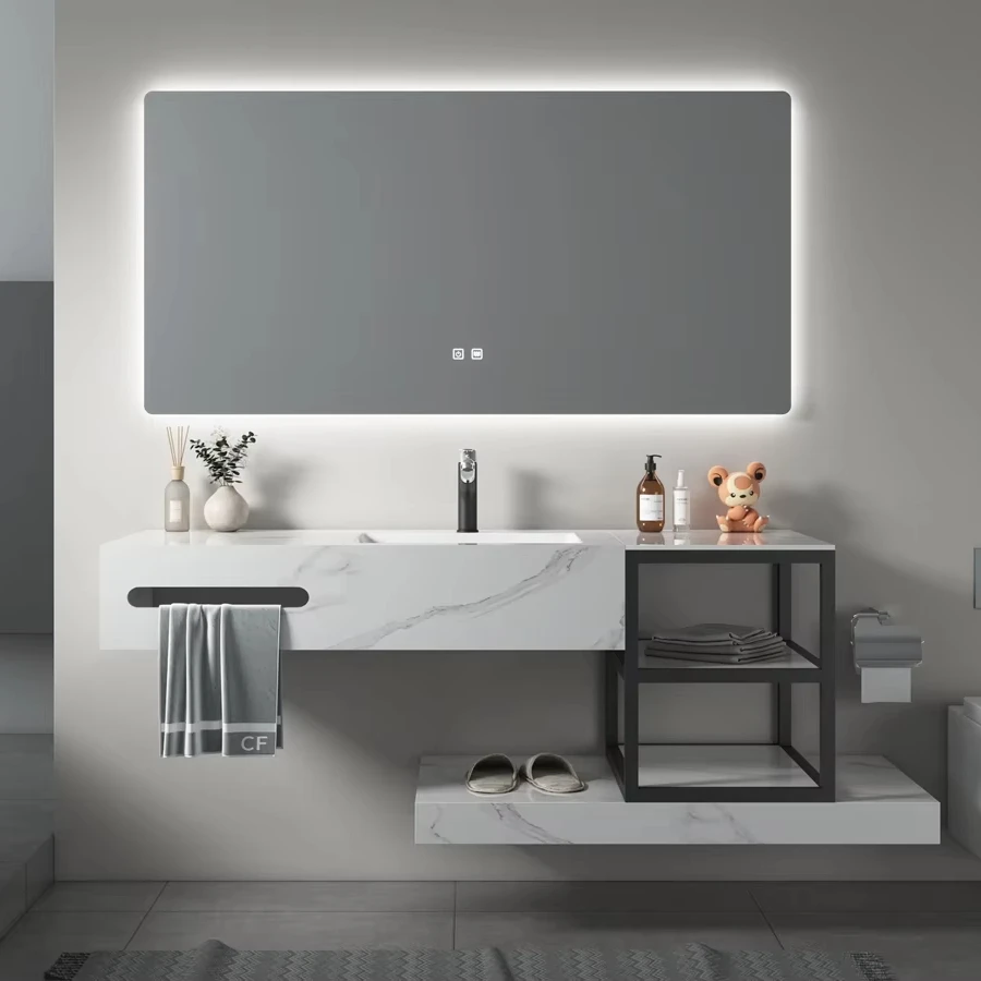 Juego de tocador de baño moderno para el hogar o el hotel con iluminación LED, lavabo de cerámica y tocador para baño o área de maquillaje