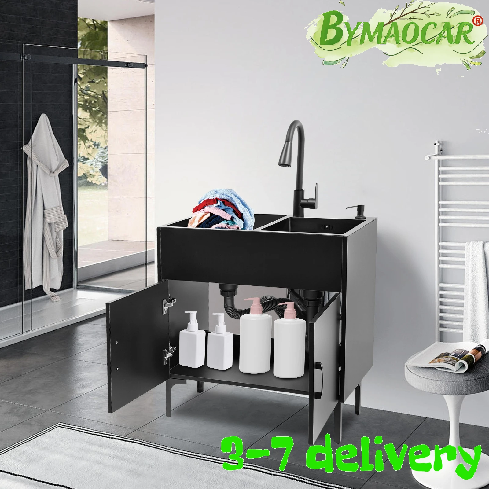 Fregadero de Lavandería, Tina Utilitaria con Grifo Extraíble, Mueble de Doble Lavabo de 75x41cm, de Acero Inoxidable para Cocina con Kit de Escurridor