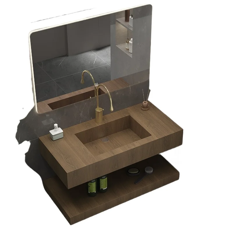 Mueble de baño con lavabo integrado, curvatura en caliente, losa de roca de estilo Medieval, madera maciza, lavado a mano, mesa facial, mesa de baño