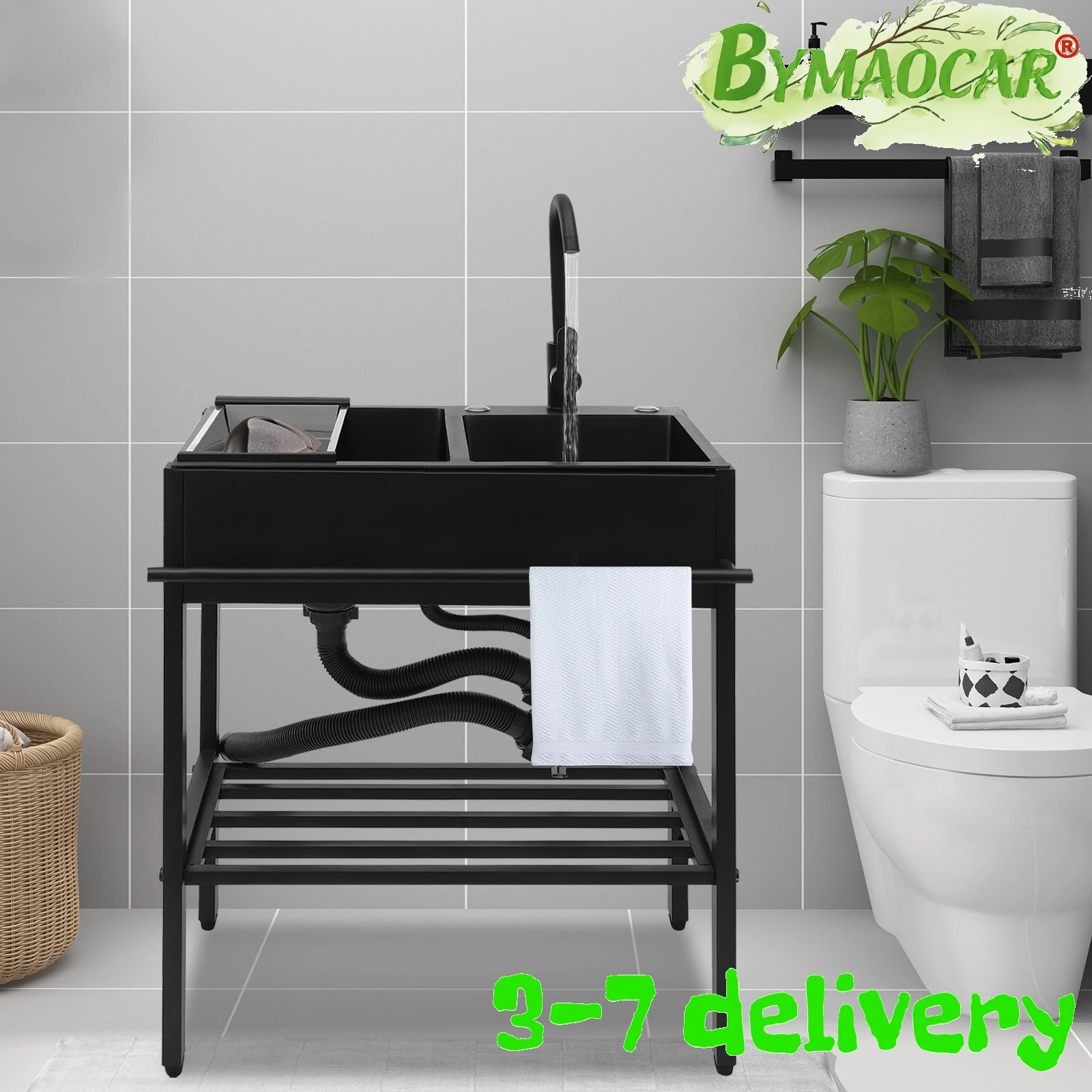Fregadero de Lavandería, Tina Utilitaria con Grifo Extraíble, Mueble de Doble Lavabo de 75x41cm, de Acero Inoxidable para Cocina con Kit de Escurridor
