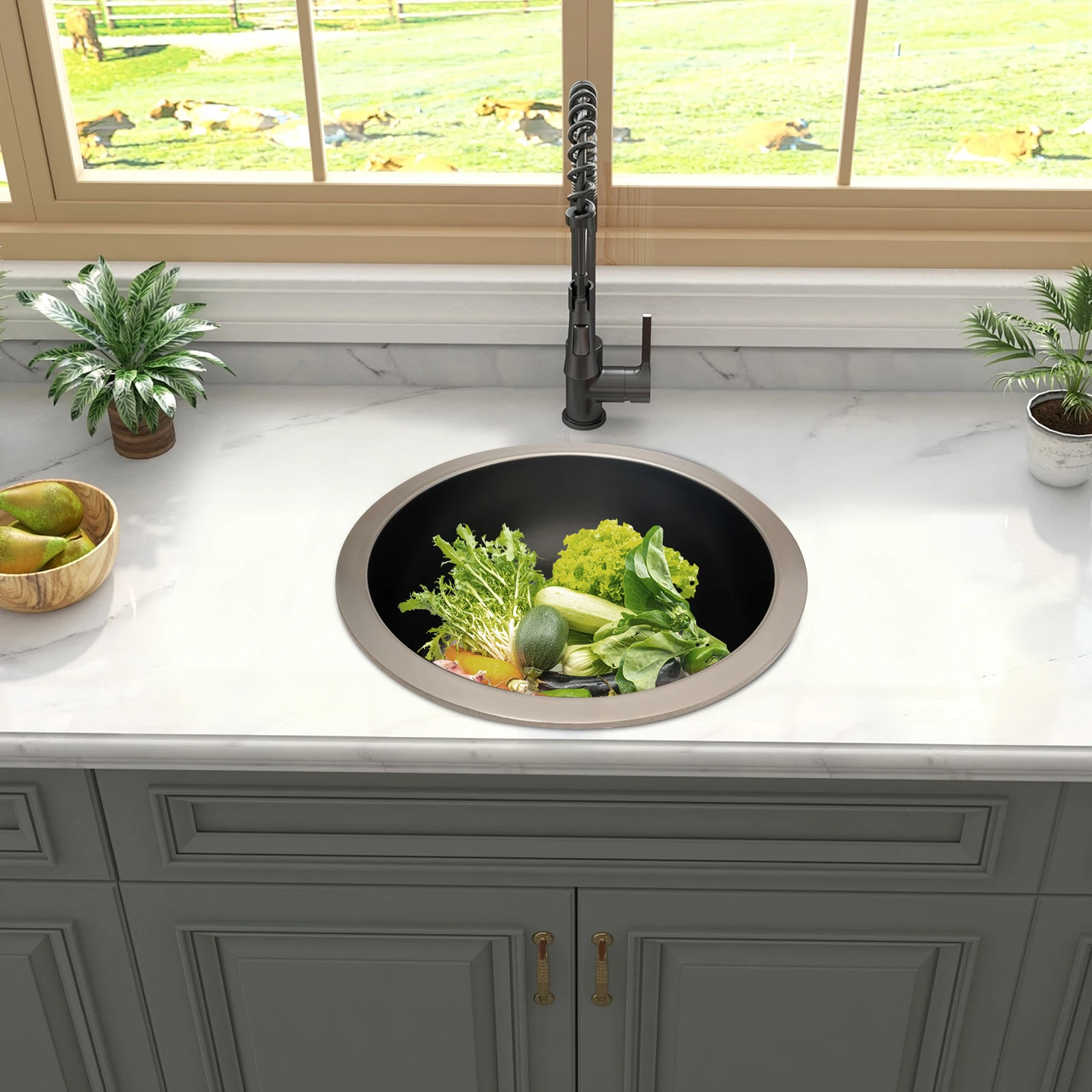 Lavabo Redondo Individual de Acero Inoxidable 201, Lavabo Profundo de 7.09 Pulgadas con Recubrimiento Nano, con Desbordadero y Almohadilla Amortiguadora de Sonido para Cocina y Baño