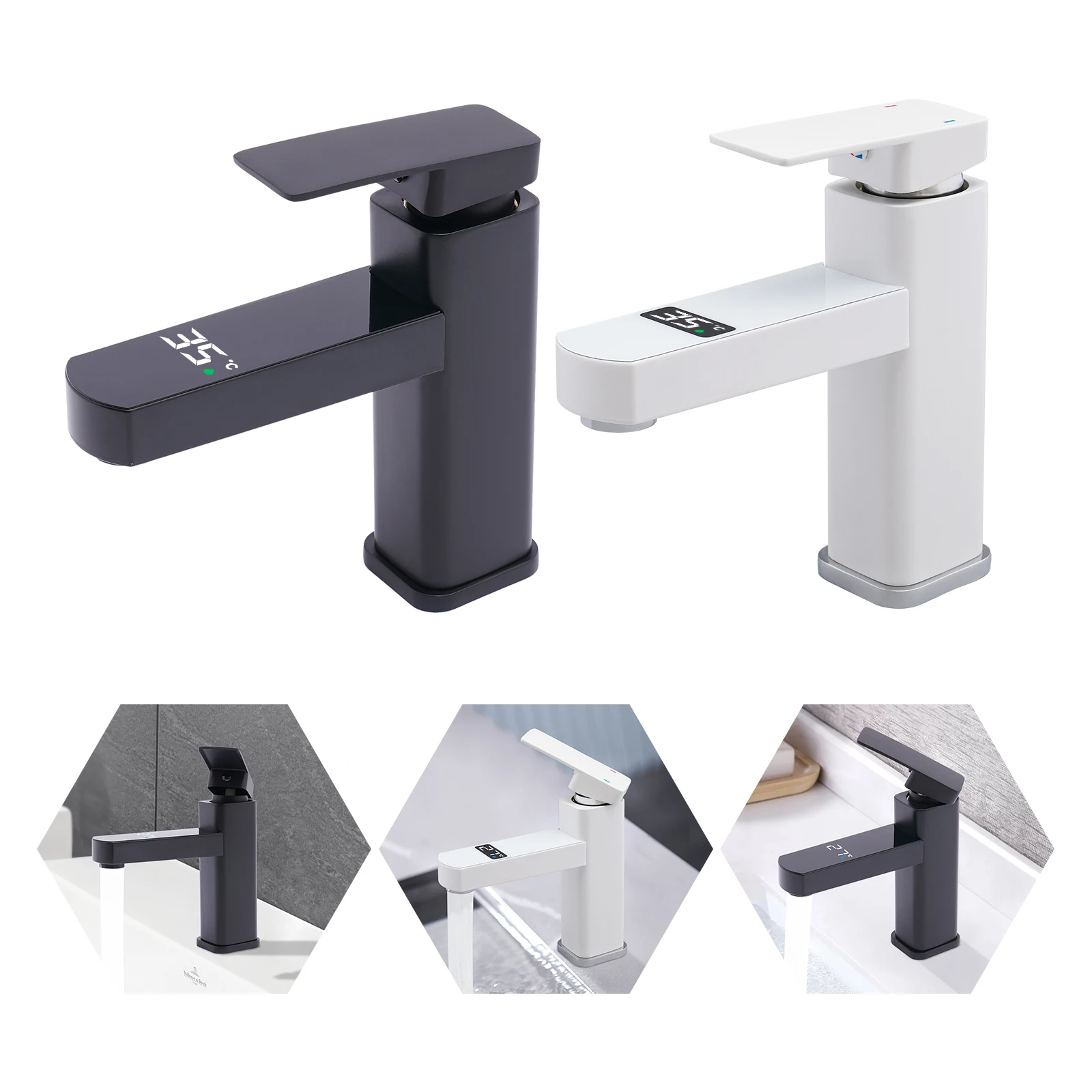 Grifo de Baño con Agua Fría y Caliente, Pantalla LED Digital, Control de Temperatura, Válvula de Cerámica, Montaje en Superficie, Negro/Blanco, G1/2"