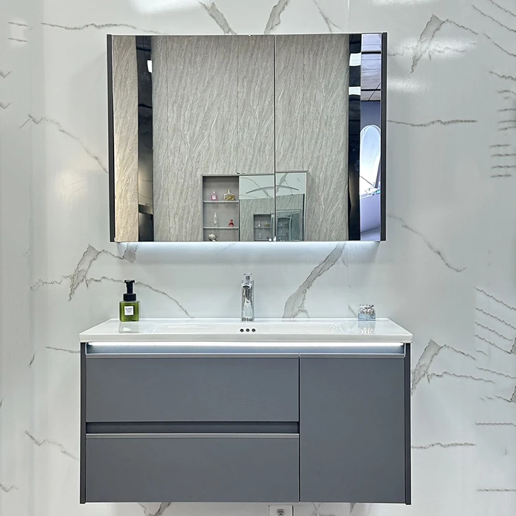 Mueble de tocador de baño moderno con lavabo de cerámica integrado, Combo de lavabo, mueble con espejo flotante montado en la pared, grifo de drenaje