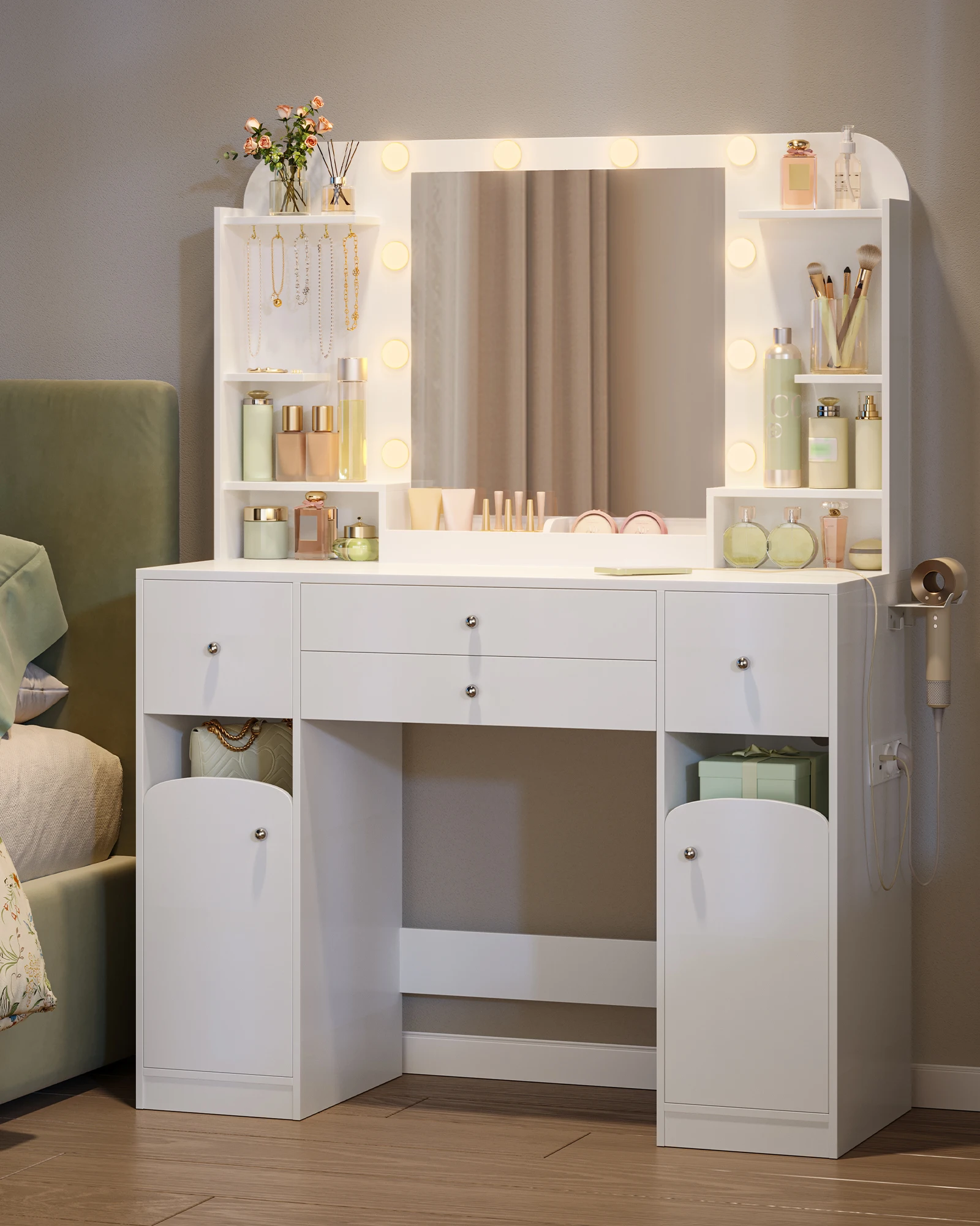Hzuaneri Tocador con iluminación LED con enchufe y soporte para secador de pelo, con 2 cajones grandes con bandeja para joyería, blanco