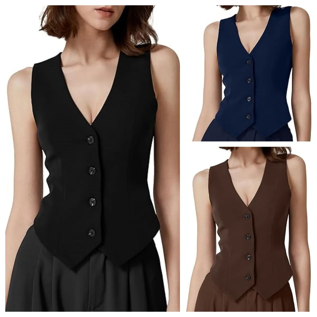 Chaleco clásico básico para mujer, chaleco con botones y cuello en V sin mangas a la moda, prendas de vestir de Color sólido, camisa ajustada, chalecos tipo Blazer recortados