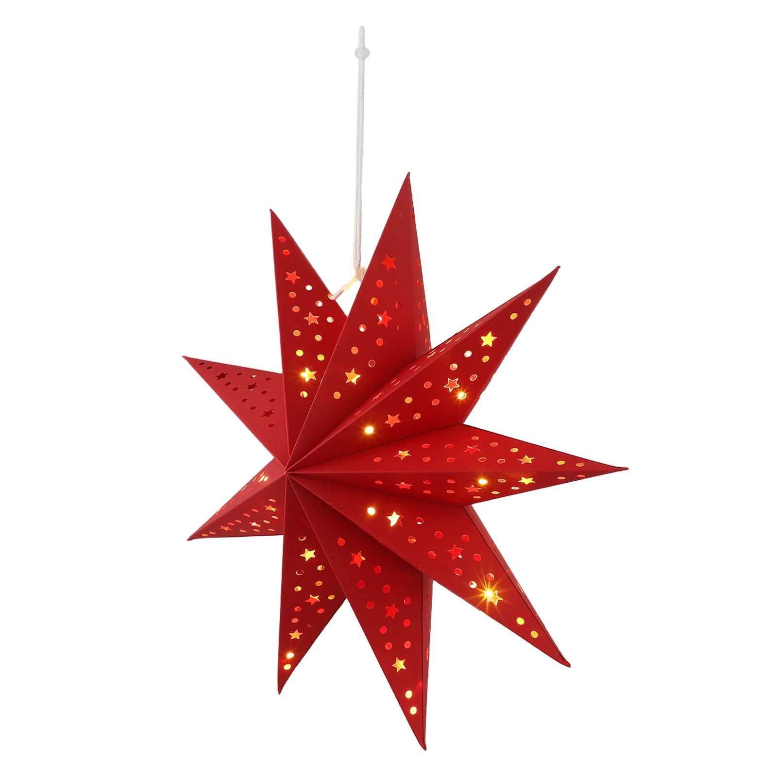 Linterna de papel de estrella 3D de Navidad, pantalla de estrella de Navidad hueca de 9 puntos de 13,76 pulgadas, decoración colgante, luz roja para fiesta navideña