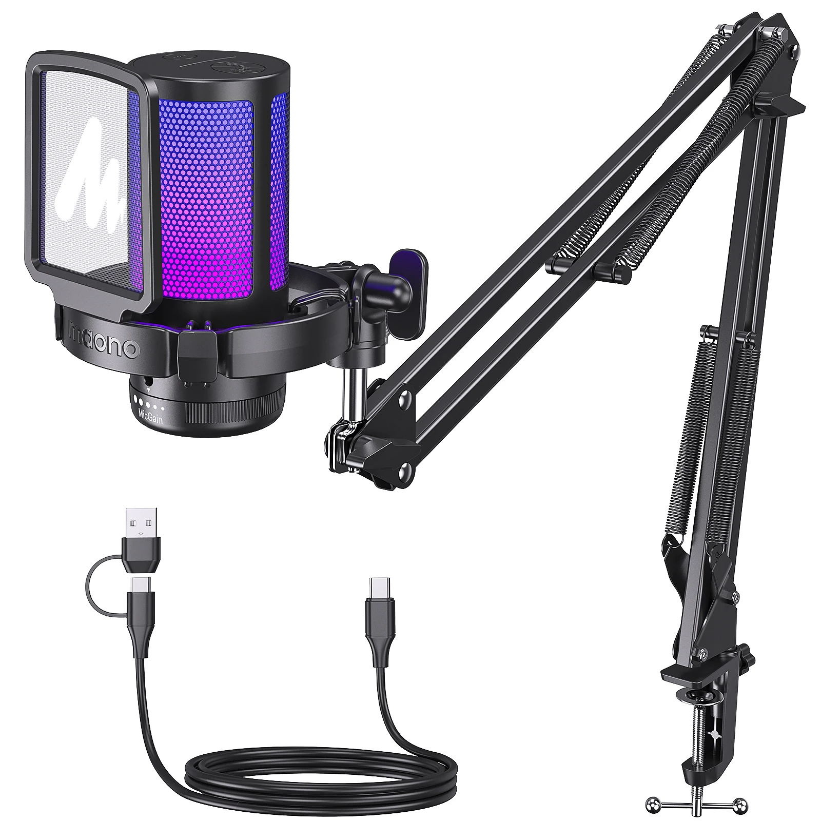 Micrófono USB para Juegos Maono DGM20S con Cancelación de Ruido, Luces RGB, Silenciador, Monitoreo de Latencia Cero para Transmisión en Vivo y Podcasting