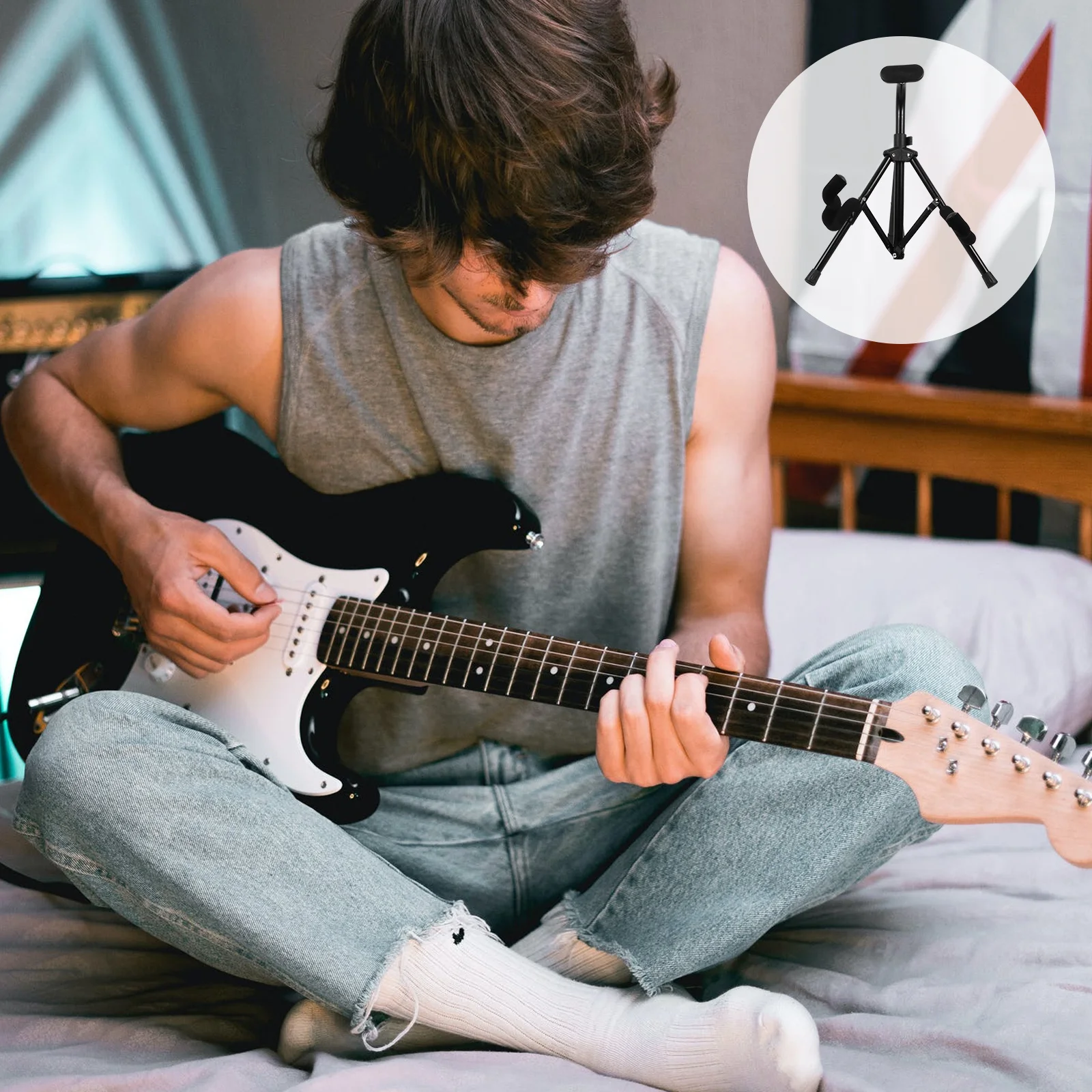Estante plegable para guitarra, soporte para instrumentos musicales de alta resistencia, mangas de goma, soporte de suelo, trípode para ahorro de espacio, almacenamiento de guitarra, 1 ud.