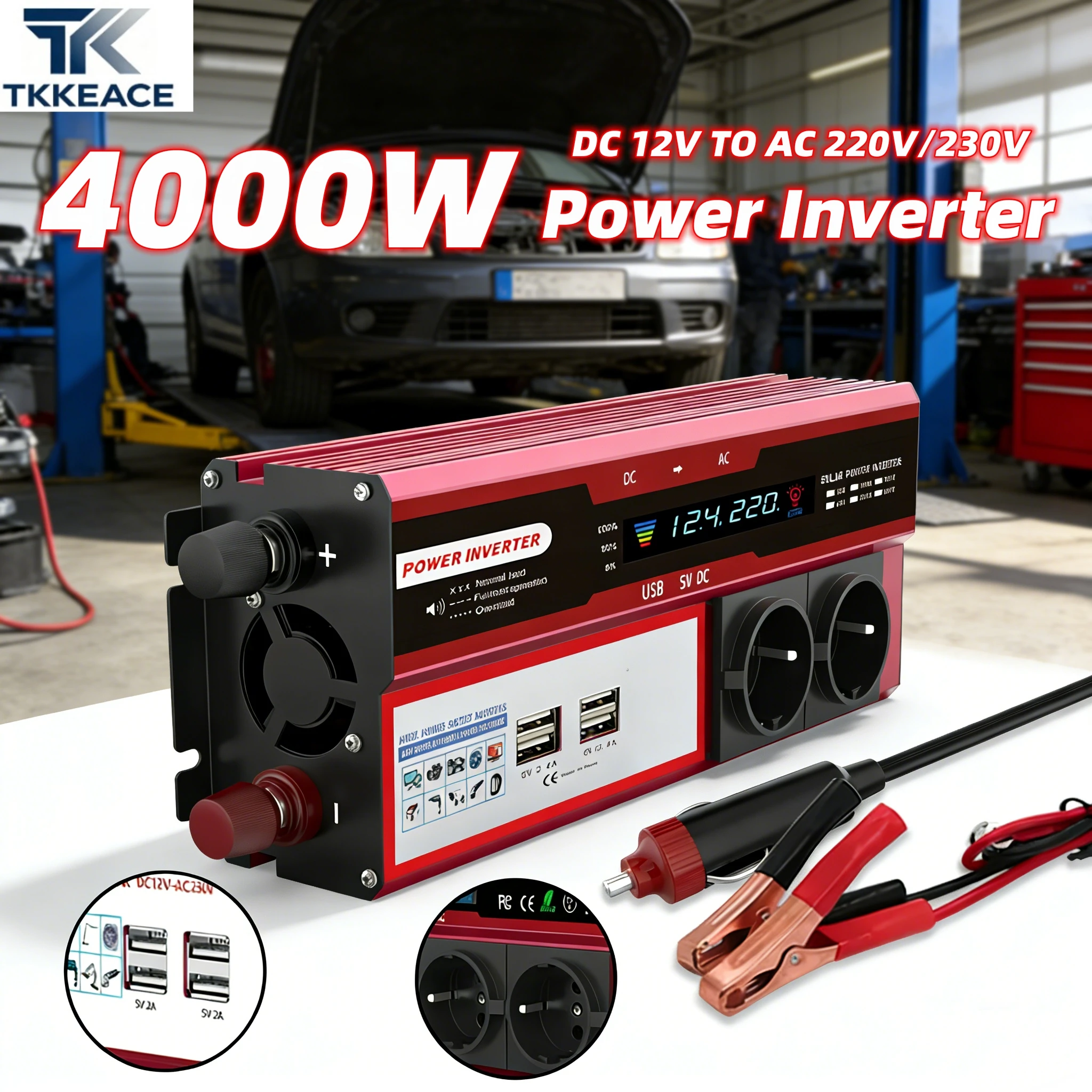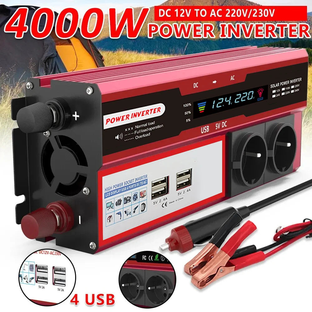Inversor de Corriente TKKEACE de 4000W, Transformador de CC 12V 24V a CA 220V, Convertidor Multifunción para Auto con Enchufe EU, Herramientas con Pantalla LED