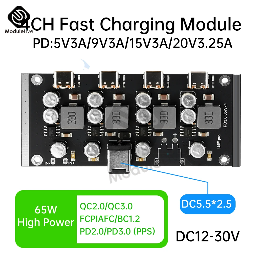 Módulo de carga rápida PD65W de 4 vías, interfaz PRO tipo C, compatible con PD3.0/2,0 QC3.0/2,0 FCP AFC, carga rápida DC5.5*2.5/DC5.5*5.1