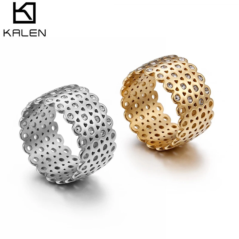 KALEN-anillos de acero inoxidable para mujer, sortija de Color dorado con diamantes de imitación de 12mm de ancho, joyería de banda de boda