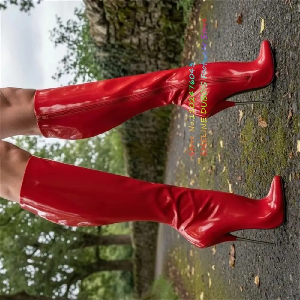Botas Altas de Charol Rojo con Tacón Metálico para Mujer, Sexy, con Punta Fina, Tacón de Aguja, Cremallera Lateral, para Espectáculos y Pole Dance