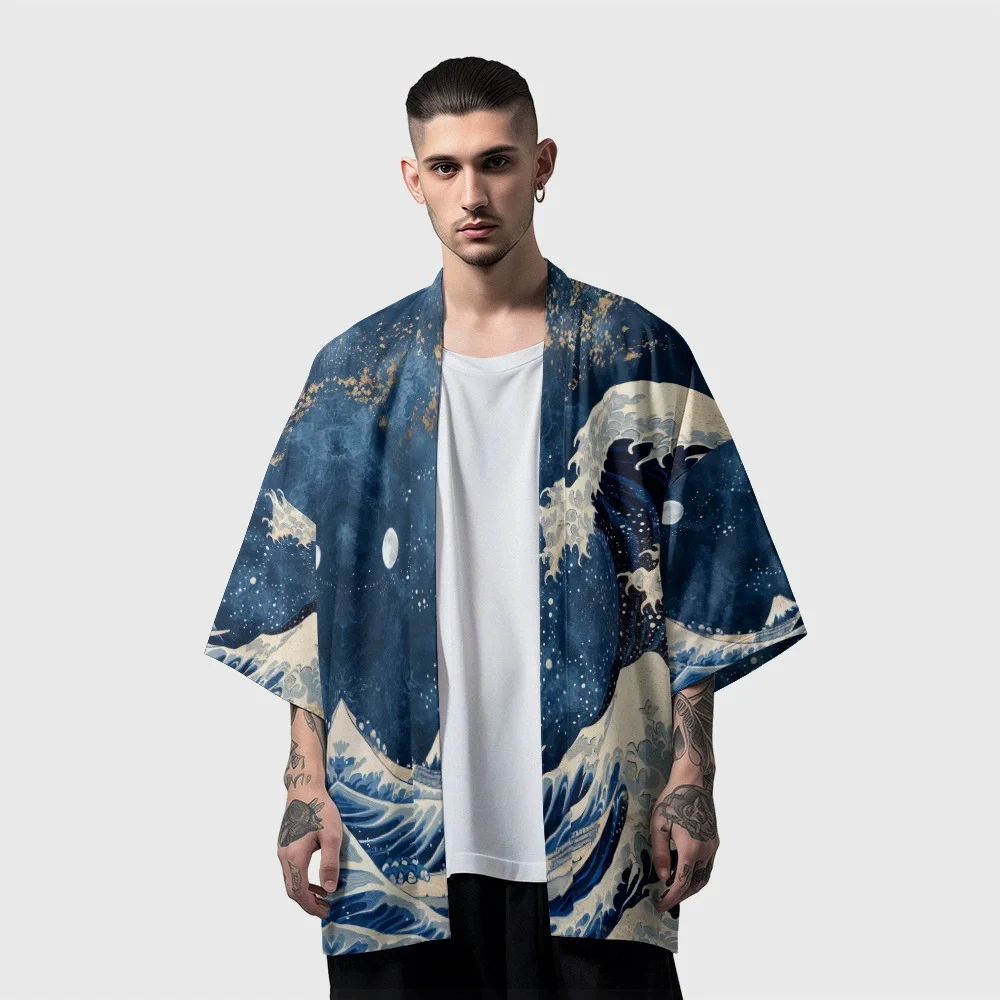 Kimono tradicional con estampado de ondas para hombre y mujer, ropa de calle japonesa, cárdigan de playa, Yukata, camisas Haori informales para Cosplay
