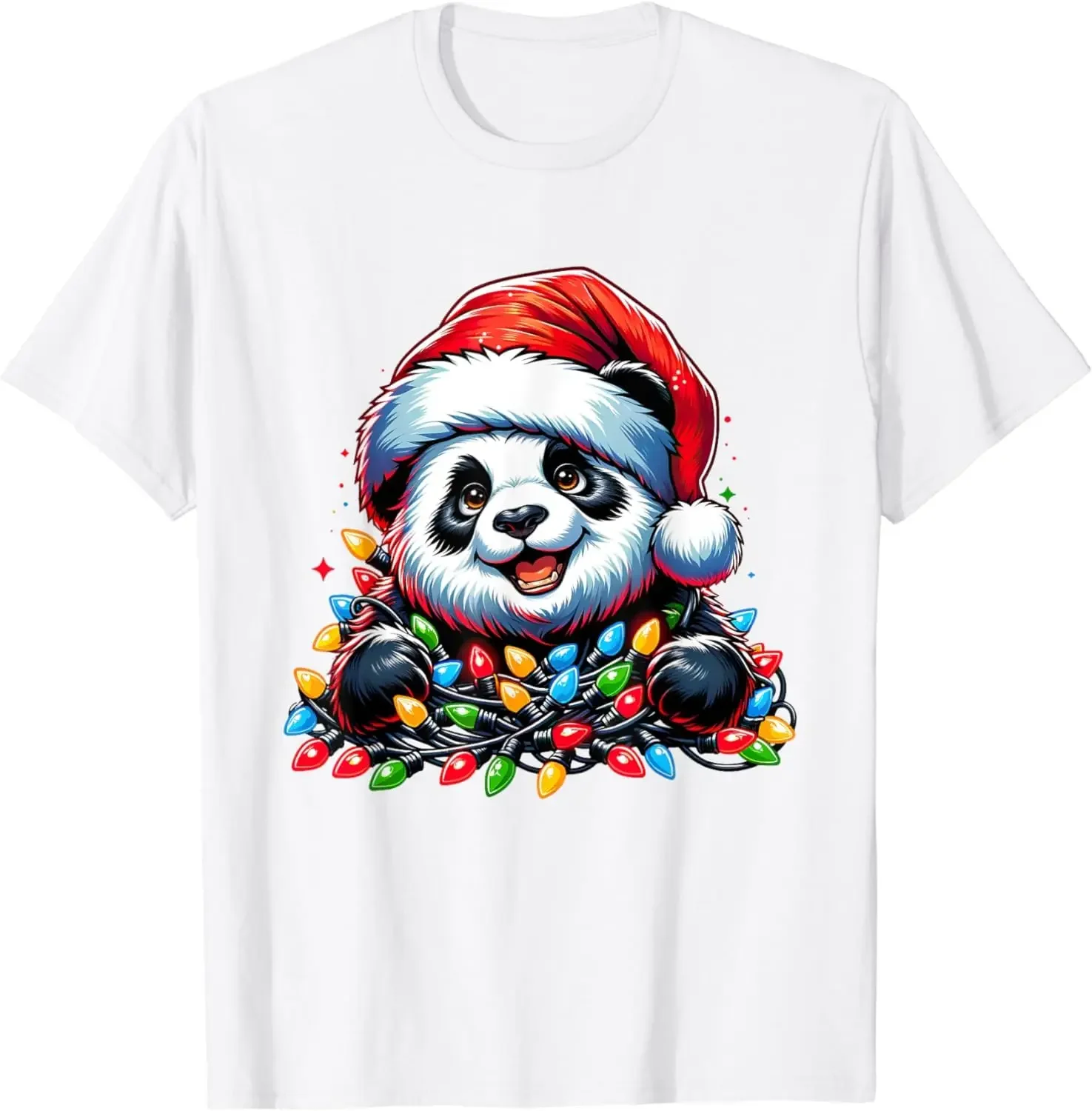 Camiseta divertida con estampado de Panda navideño y luces de cadena, camiseta transpirable de algodón de manga corta con cuello redondo para hombre