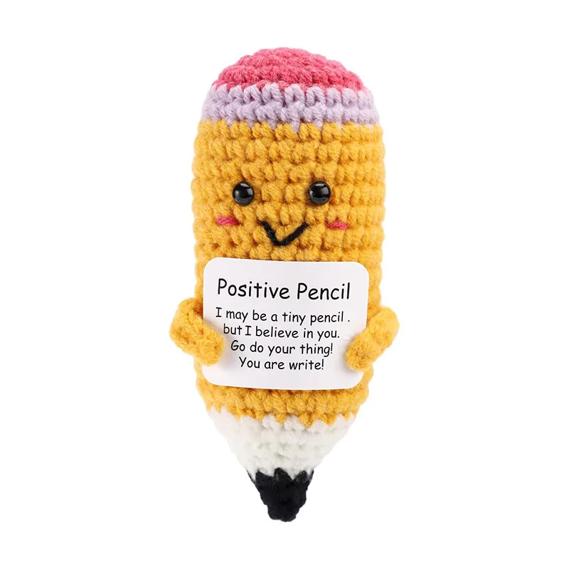 Muñeca lápiz de energía positiva tejida hecha a mano con tarjeta, adorno de escritorio, divertido ganchillo de lana, soporte emocional, regalos de muñeca lápiz
