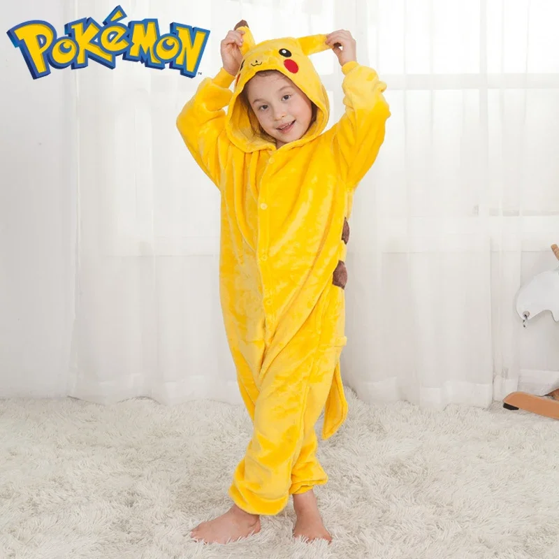 Pokemon Pikachu ropa de casa de franela cálida niños Otoño e Invierno mono suave Cosplay Animal Sudadera con capucha pijamas padres e hijos niñas ropa de dormir