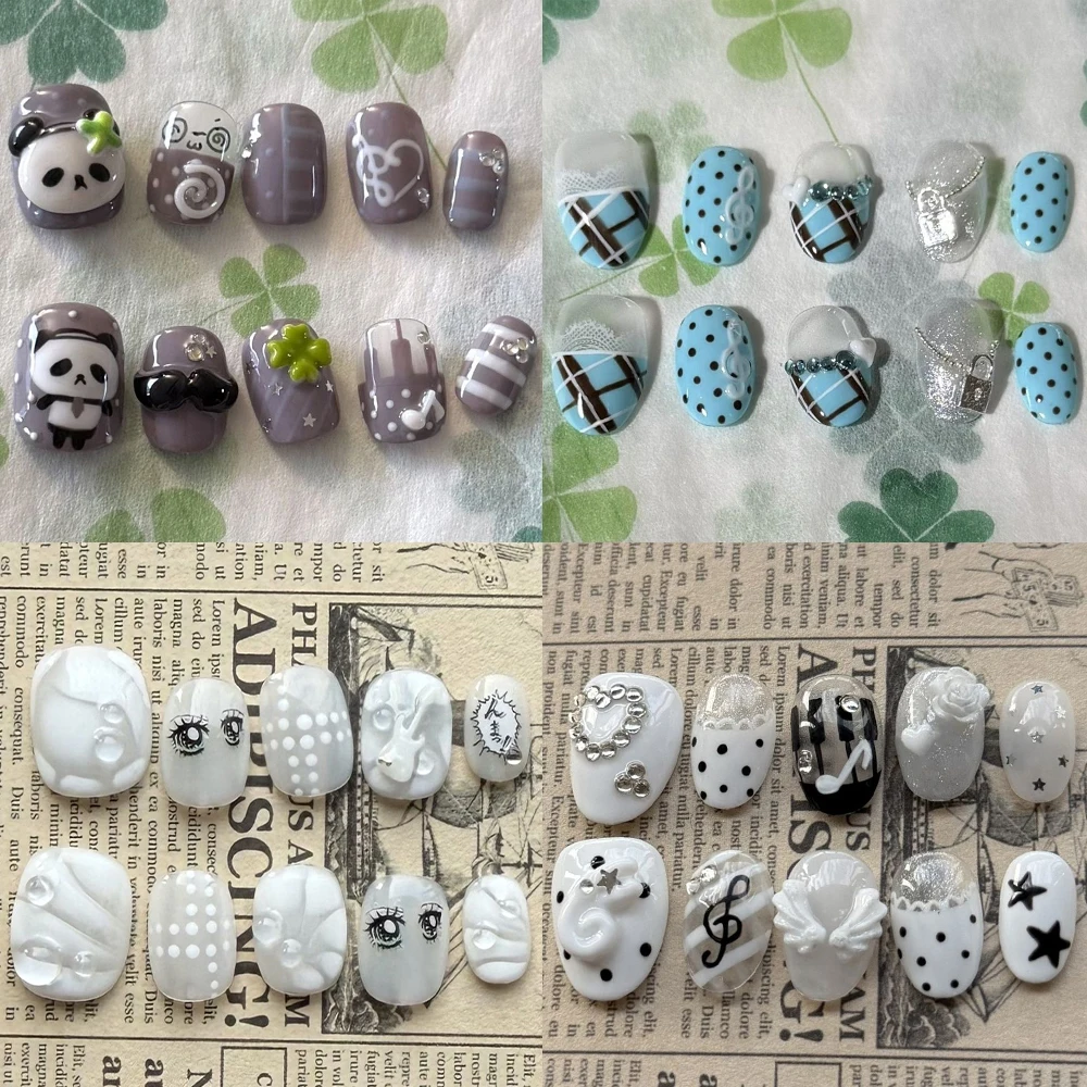 Y2K Kawaii Handmande cuadrado corto almendra reutilizable prensa en uñas alas notas musicales lunares diamante flor perla uñas postizas