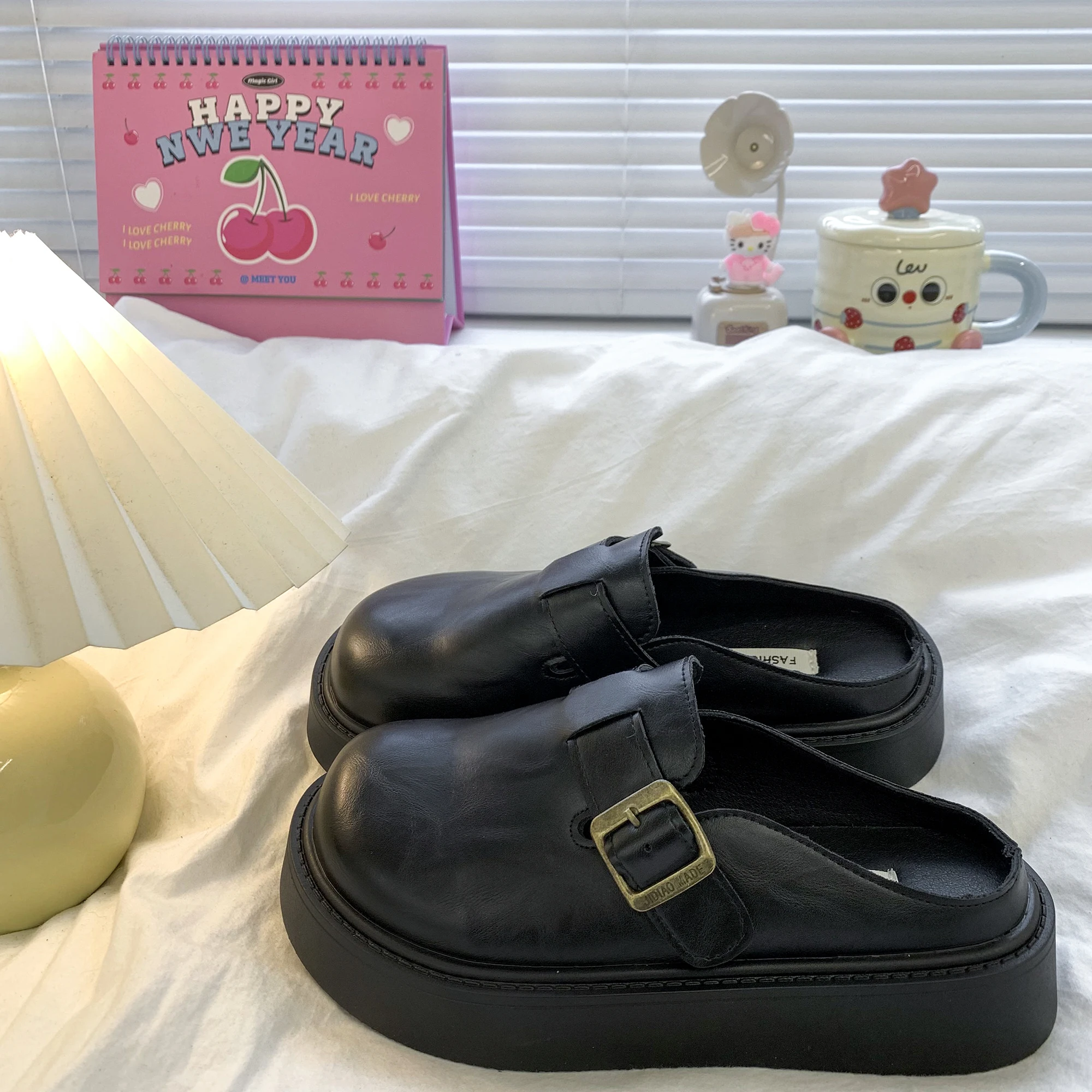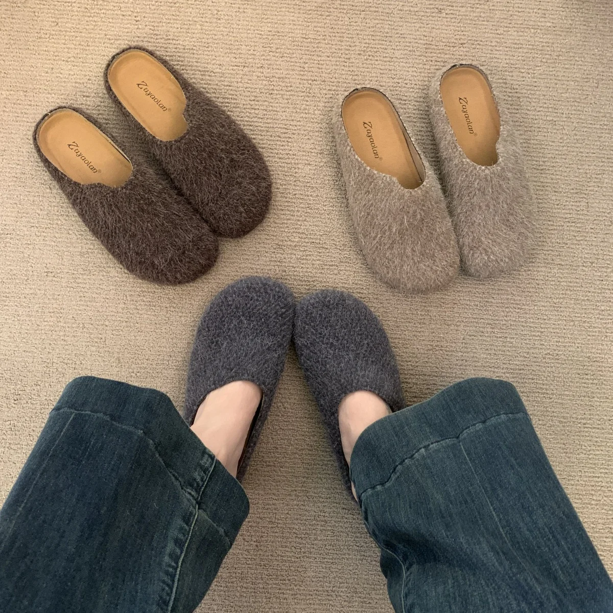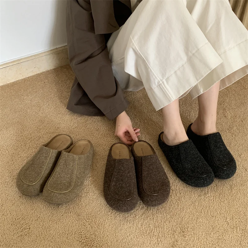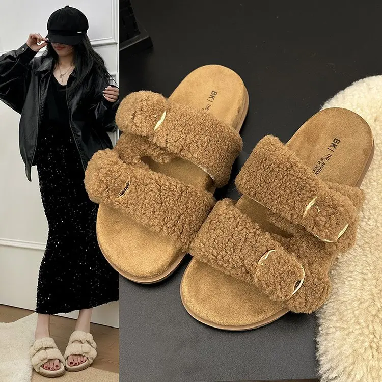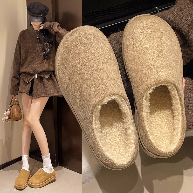 Mules para mujer 2026, zapatos de piel con cubierta, zapatillas para mujer, calzado de invierno Pantofle, nuevas chanclas Retro de felpa, zapatos de piel para invierno para mujer
