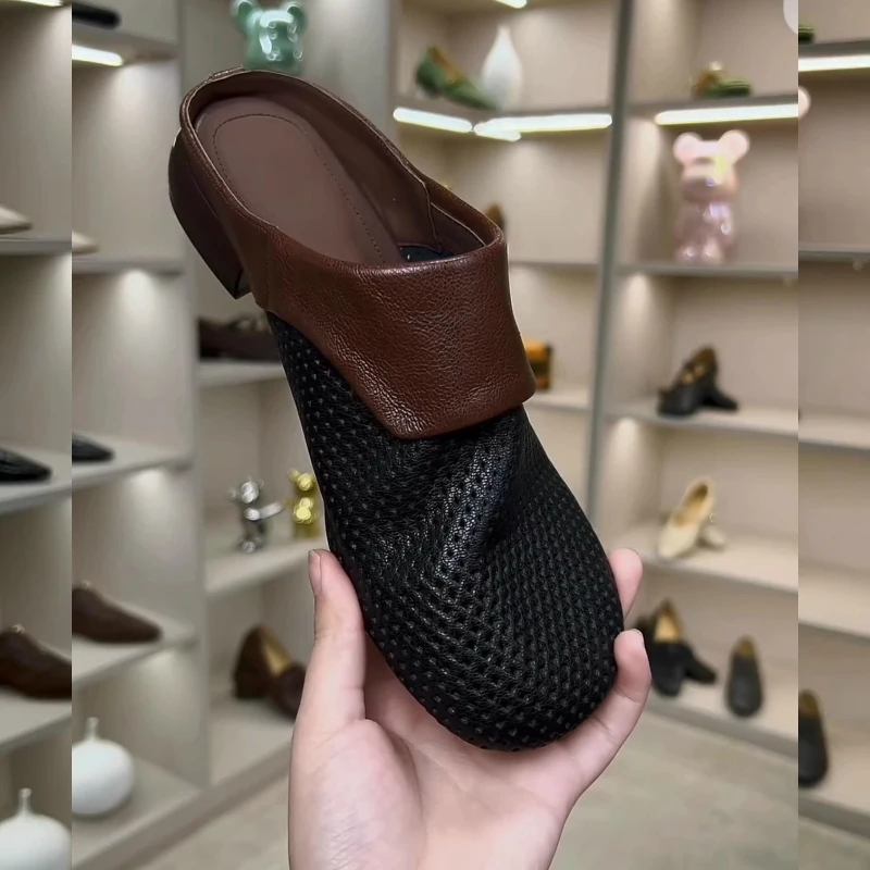 Zapatos de mujer con punta cubierta, zapatillas de mula para mujer, tacones calados, Pantofle, mulas bajas y suaves, verano 2026, masaje de cuero genuino