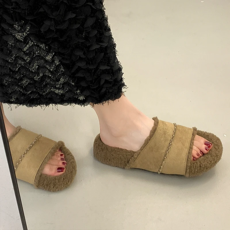 Zapatos mulas para mujer 2026, zapatillas para mujer, chanclas de piel, plataforma, Pantofle, nuevas chanclas planas suaves de felpa, zapatos de piel, Zapatillas de casa
