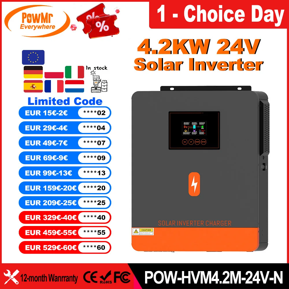 Inversores Solares Híbridos PowMr de 4.2KW 24V EU, Onda Sinusoidal Pura, Controlador de Carga Solar MPPT de 120A Integrado para Panel Solar de 60-500VDC