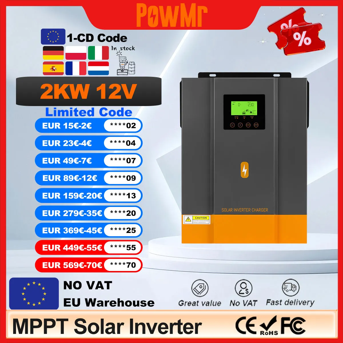 PowMr tenía 2KW inversores solares híbridos 12V a 220VAC batería de carga de onda sinusoidal pura 80A MPPT controlador de carga Solar Max PV 400VDC