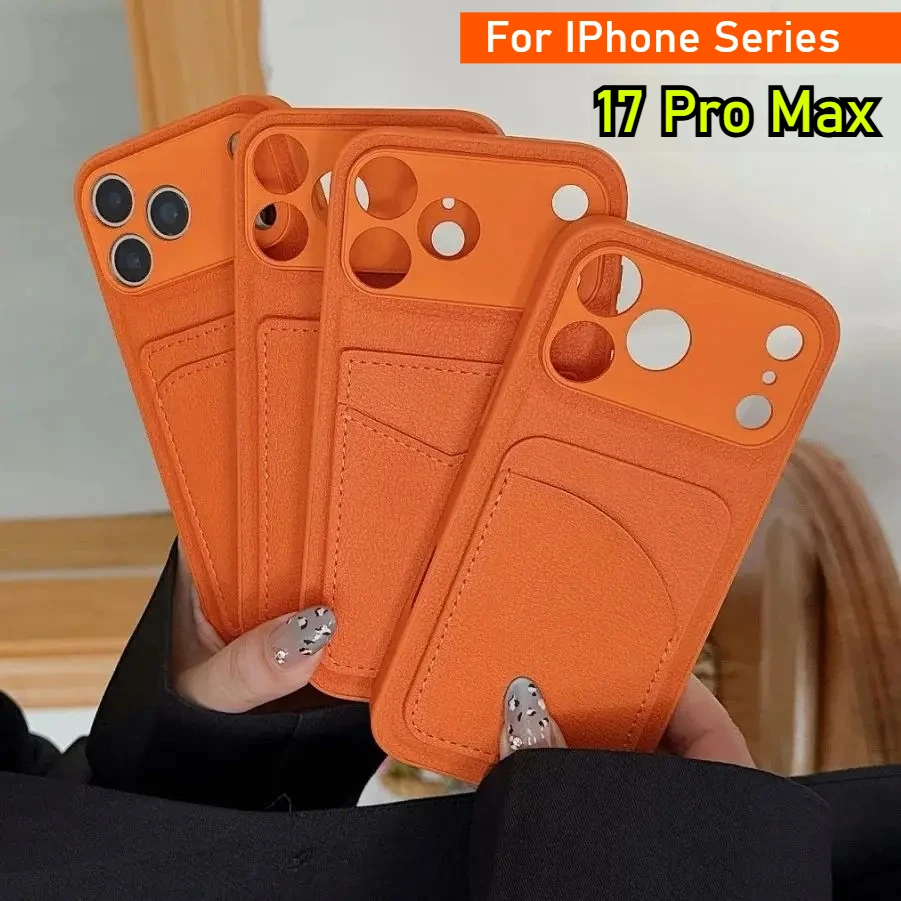 Leather Orange Color Card Holder Case For iPhone 17 Air 16 E 15 14 13 12 Mini 11 Pro X XR XS Max 7 8 Plus SE Wallet Pocket Cover