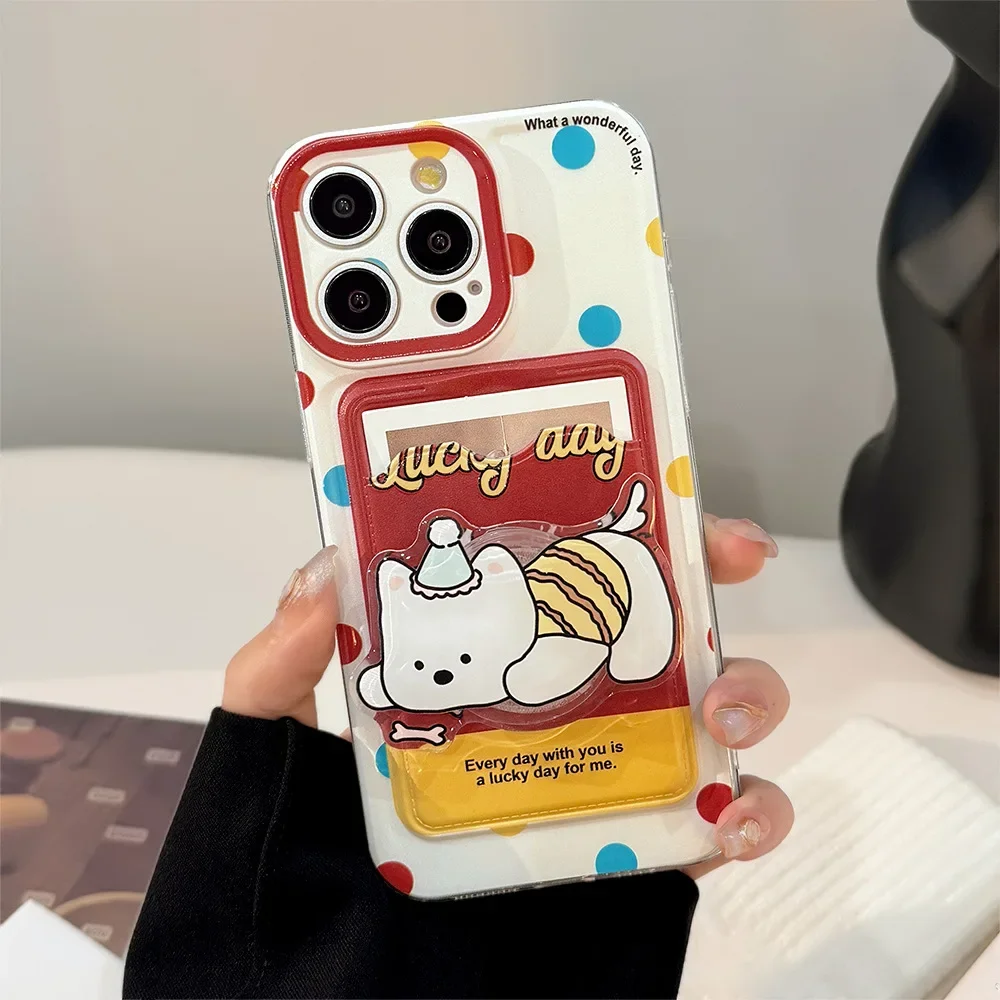 Funda de teléfono con soporte para tarjetas y cachorro de dibujos animados, funda suave con cordón para iPhone 16 15 14 13 12 11 Pro Max XS X XR 7 8 Plus