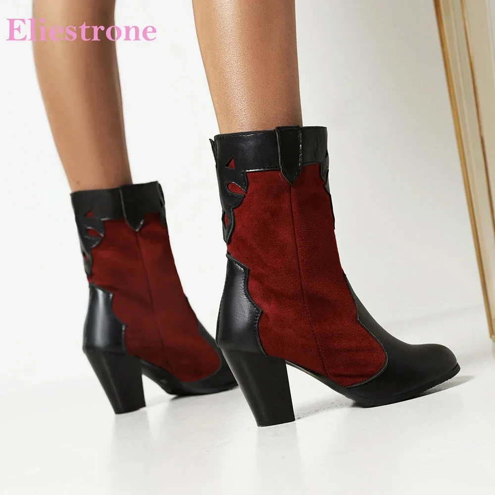 Nueva moda de invierno, botas de media pantorrilla para mujer, color rojo vino, marrón, tacones cuadrados altos, zapatos de vestir para mujer, talla pequeña y grande 11 30 45 48