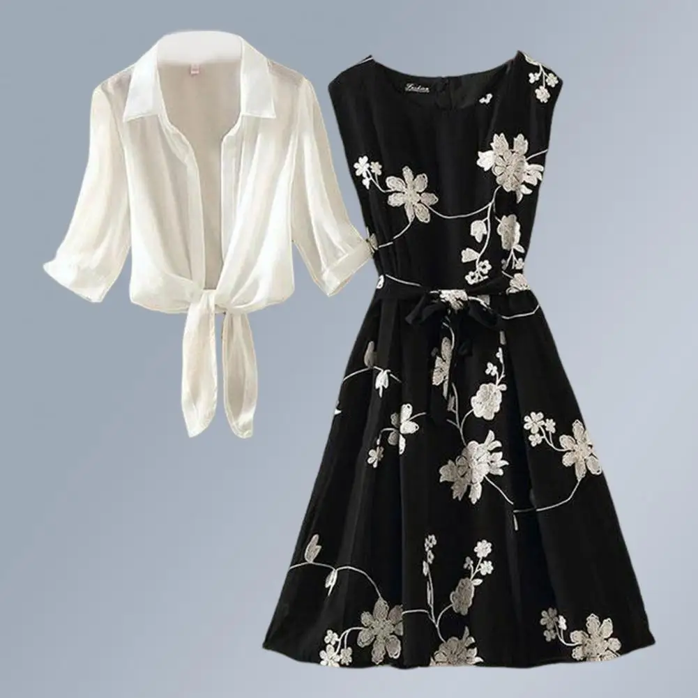 Vestido Retro con estampado Floral para mujer, conjunto de vestido con cordones en la cintura, cárdigan transparente, abrigo sin mangas, vestido acampanado