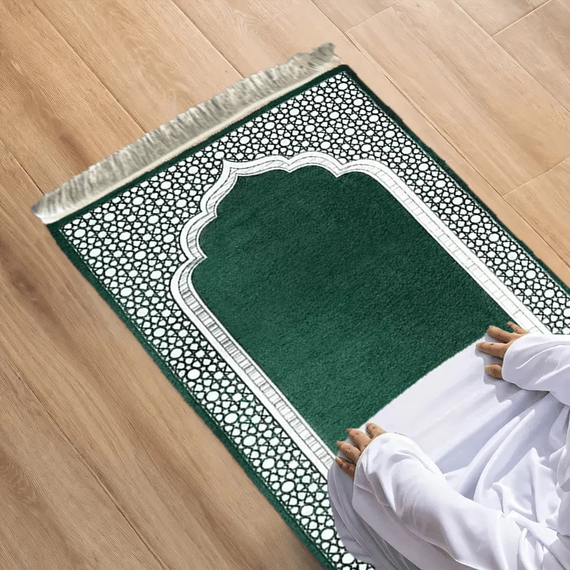Tapis de prière VIKAMA vert foncé à motifs, tapis de prière doux à franges, portable, adapté à une utilisation en intérieur et en extérieur, tapis de prière musulman