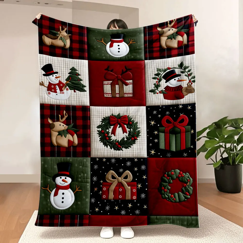 Couverture patchwork de couette de Noël – Renne festive, bonhommes de neige, coffrets cadeaux et couronnes de houx en rouge, vert, noir, blanc ; Doux et confortable