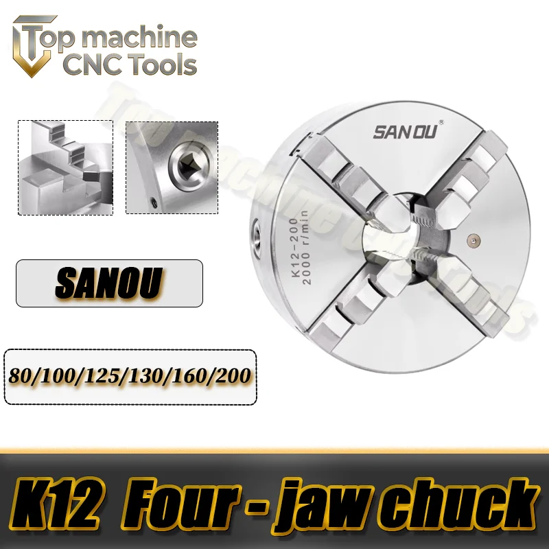 Mandrin de tour auto-centrant à 4 mâchoires SANOU K12-80/100/125/130/160/200, montage avant K12-100, mandrin manuel en métal à 4 trous pour mini-tour