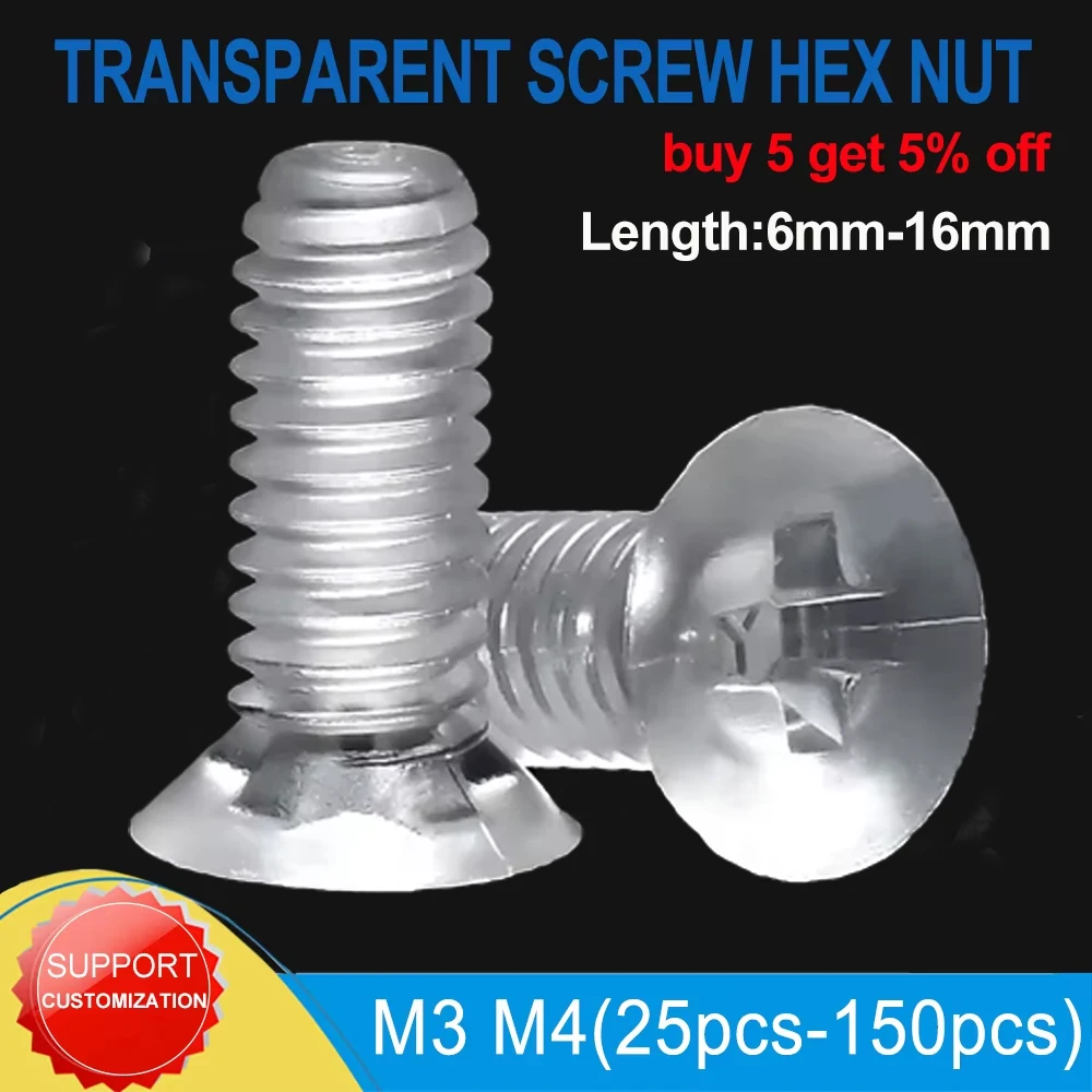 25/35/55/150 pièces écrou hexagonal vis transparente plat Phillips boulon à tête transversale acrylique plastique Transparent vis en Nylon écrous M3 M4