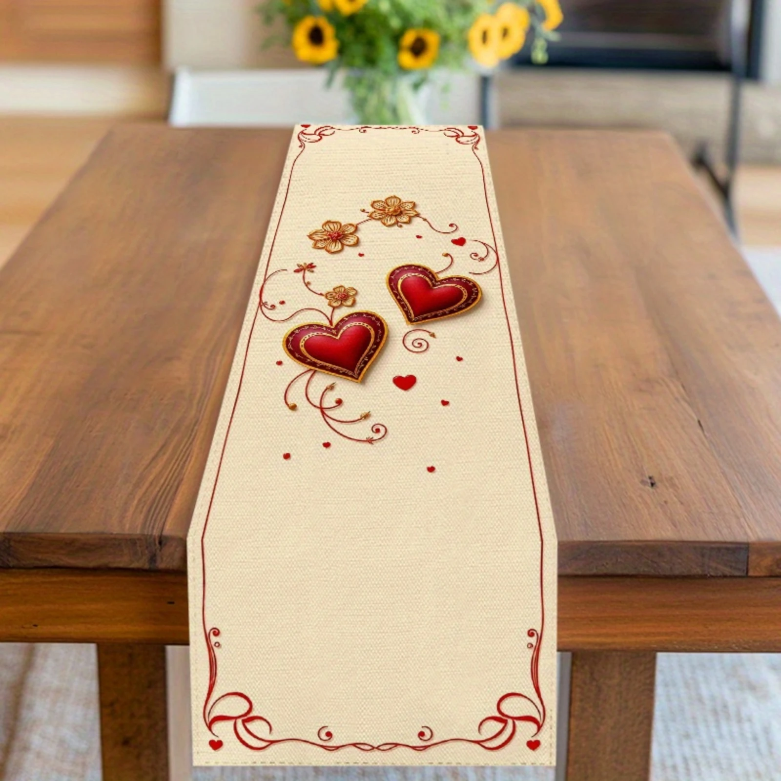 Chemin de table élégant avec fleurs dorées et coeurs rouges, décor de maison et de restaurant pour la Saint-Valentin, impression 2D festive