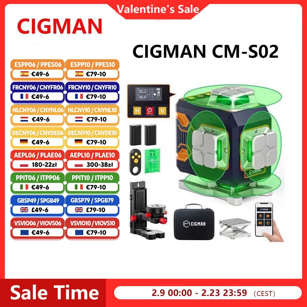 CIGMAN CM-S02 4x360 ° Niveau Laser 16 lignes, contrôle par application, écran LCD 40H, durée de fonctionnement Ultra, durée de vie de la batterie étendue, Kit d'accessoires