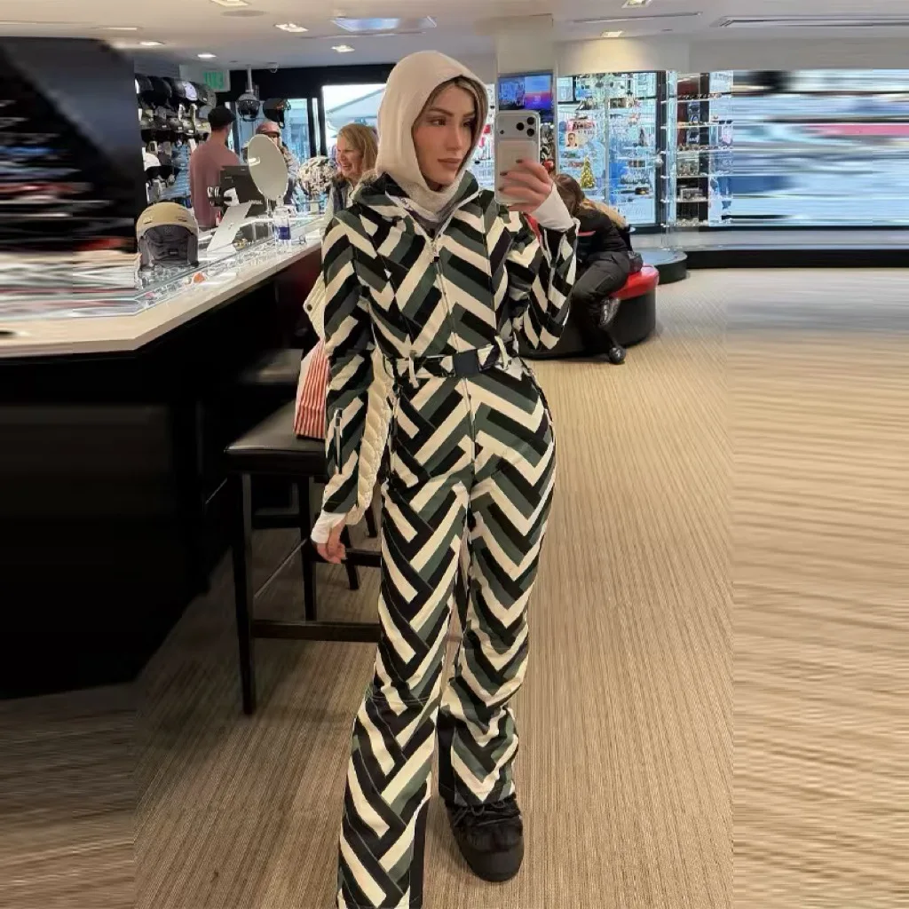 Combinaison de ski rayée pour femme, imperméable, col montant, à capuche, manteau de neige, parka sport, combinaison zippée, NOUVEAUTÉ 2026, épaisse et chaude, vêtements de ski pour femme