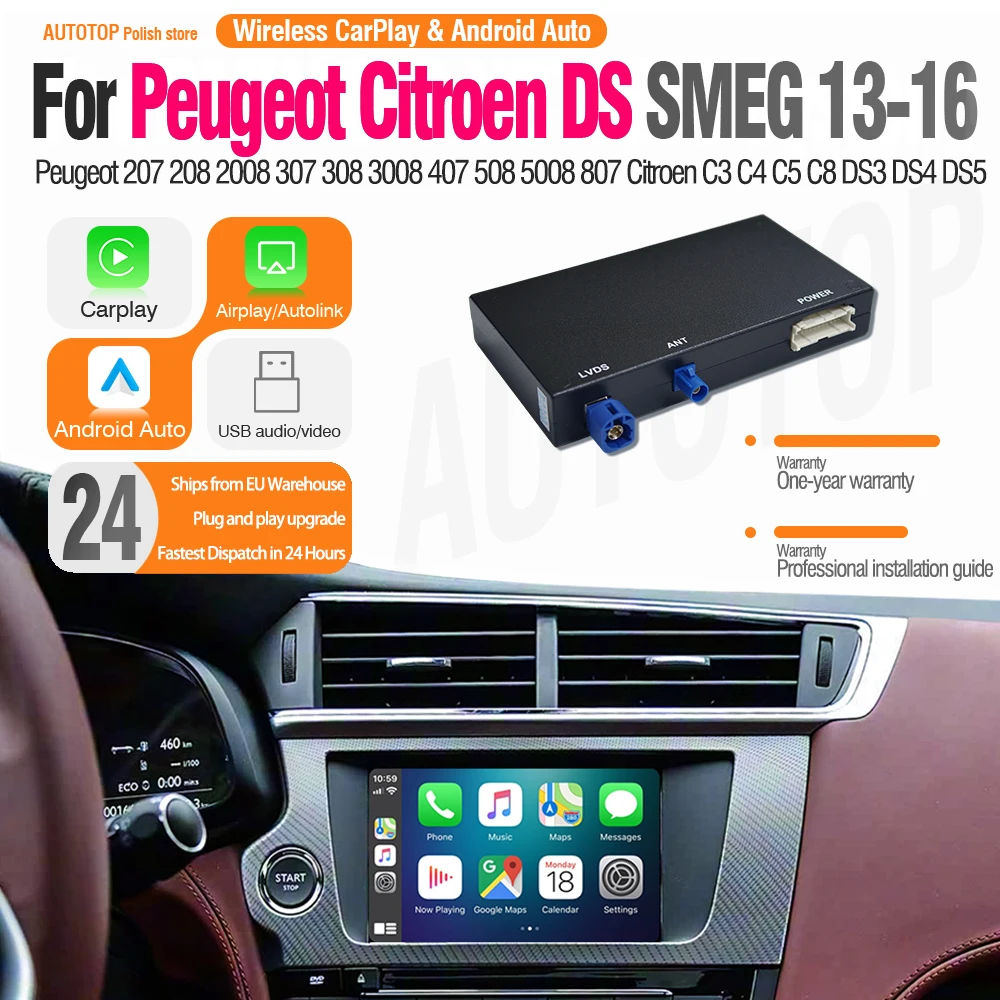 Kit CarPlay Android Auto sans fil AUTOTOP pour Cristaux SMEG Picasso C4 C5 DS4 DS3 DS5 308 508 5008 3008 compatible avec caméra de recul