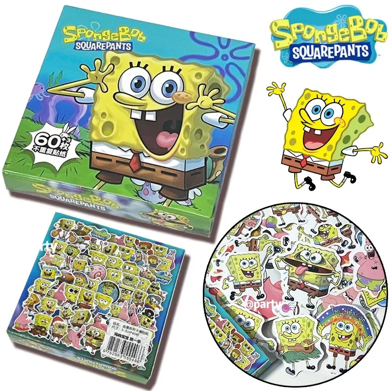 Autocollants Bob l'éponge, 60 pièces, boîte cadeau, décoration de peaux de guitare pour ordinateur portable, autocollant de manuel Patrick Star, autocollants de dessin animé d'anniversaire pour enfants