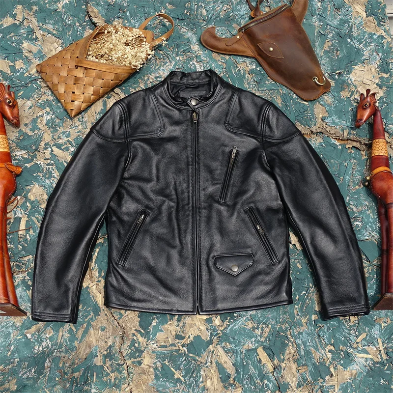 Veste de motard en cuir véritable pour homme, manteau mince, 100% cuir de vachette naturel, mode vintage, vêtements de moto