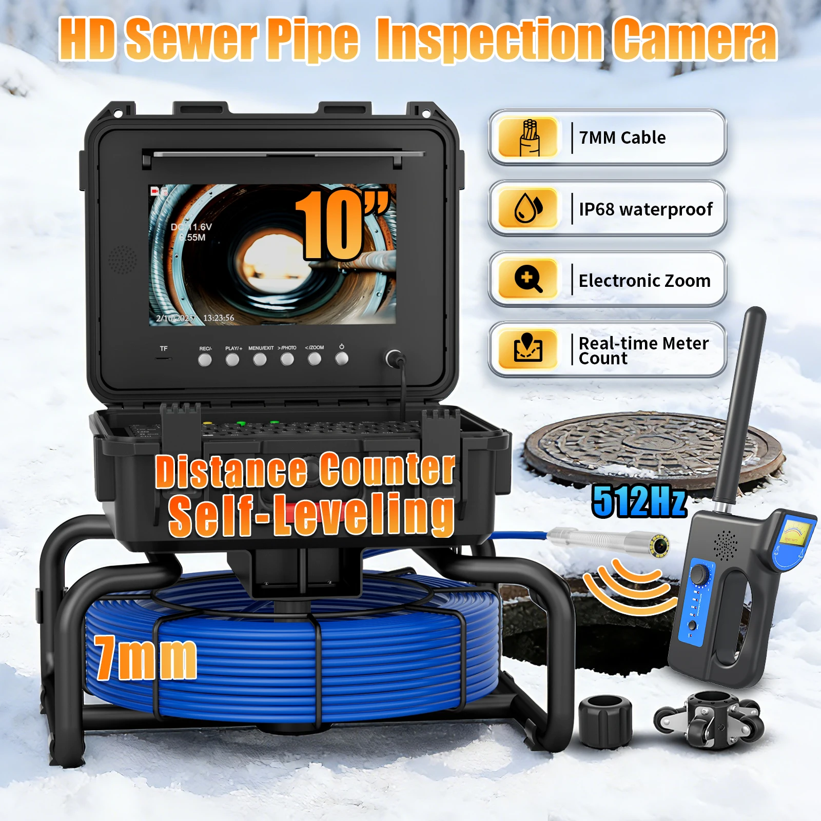 Caméra d'inspection des égouts-caméra d'égout à nivellement automatique avec localisateur sans fil 512Hz, Endoscope d'égout étanche HD avec 12 LED