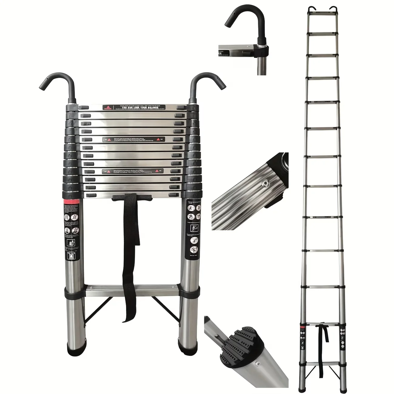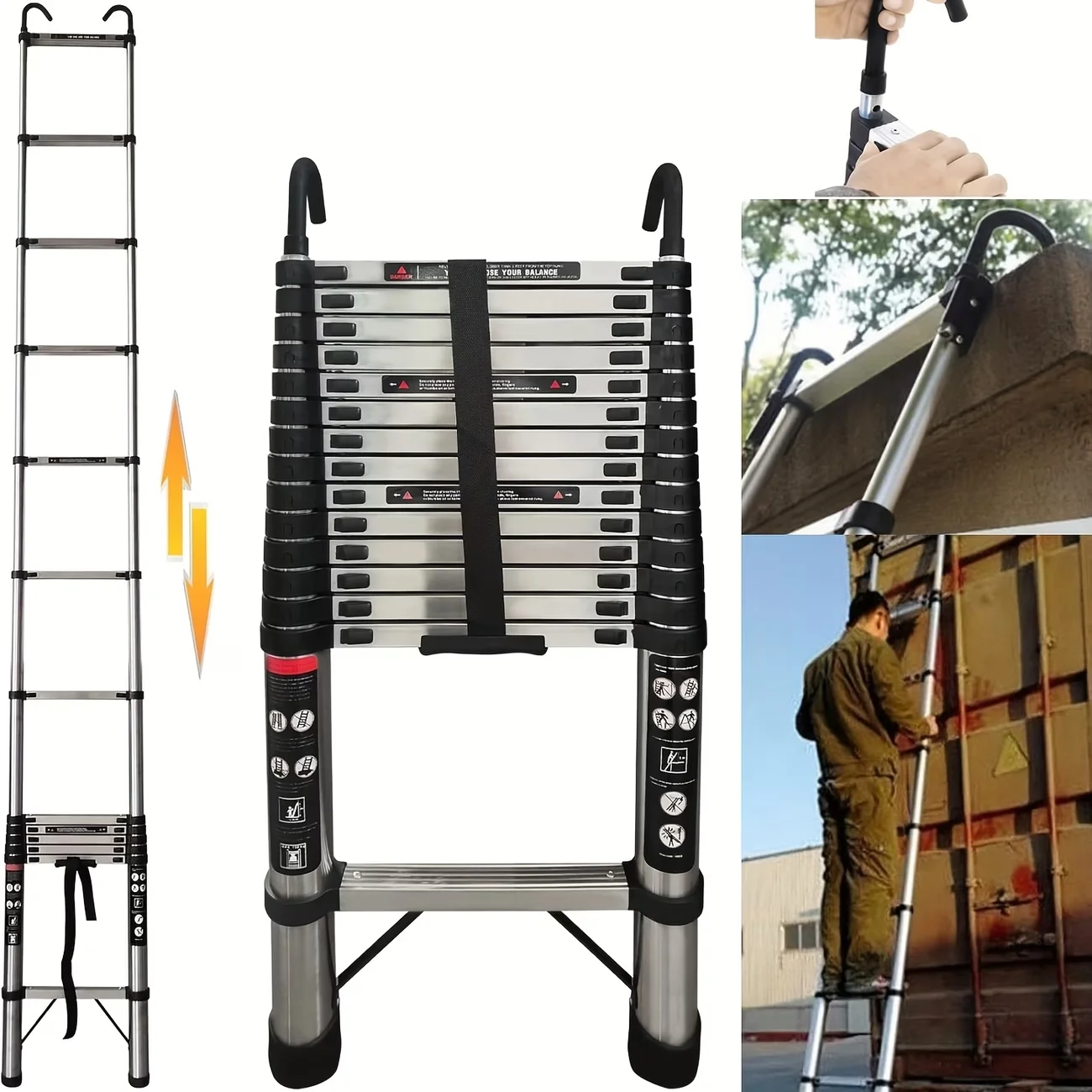 Échelle télescopique 2,6 m-6,3 m, échelle extensible en acier inoxydable, portable, norme EN131, avec crochets détachables, capacité de charge de 150 kg