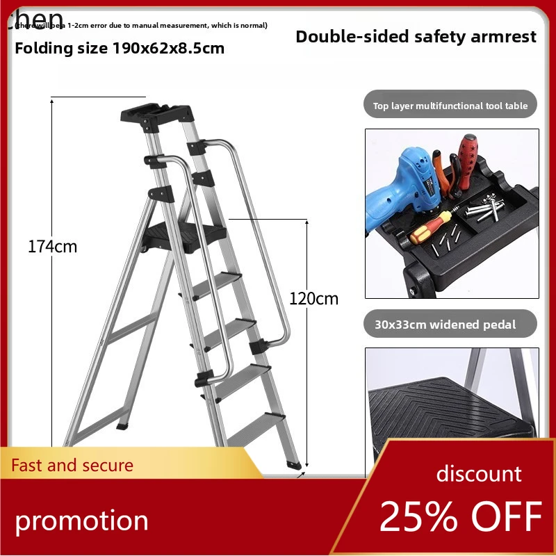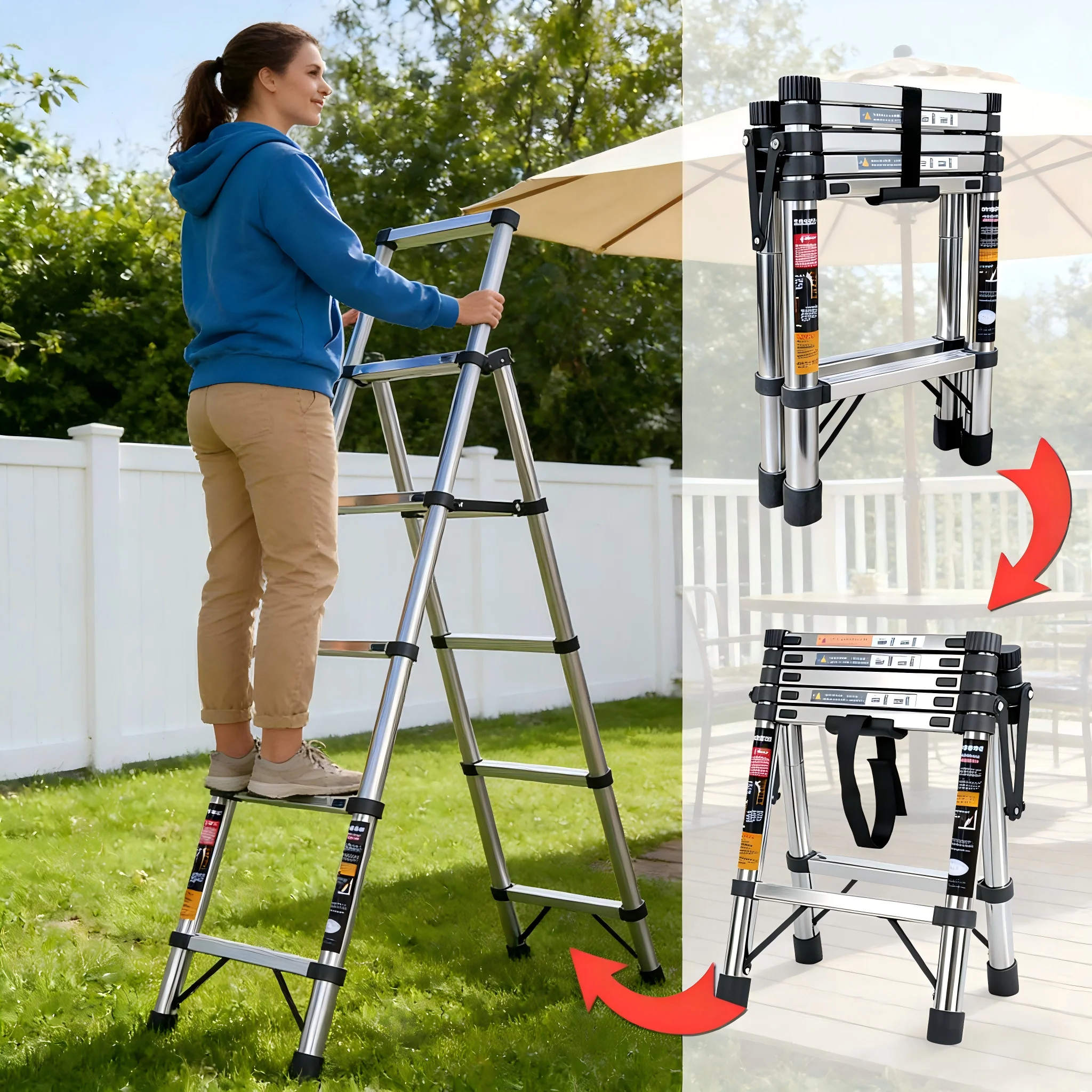 Échelle télescopique pliante en acier inoxydable multi-positions de type A avec patins antidérapants pour la rénovation et le nettoyage de la maison