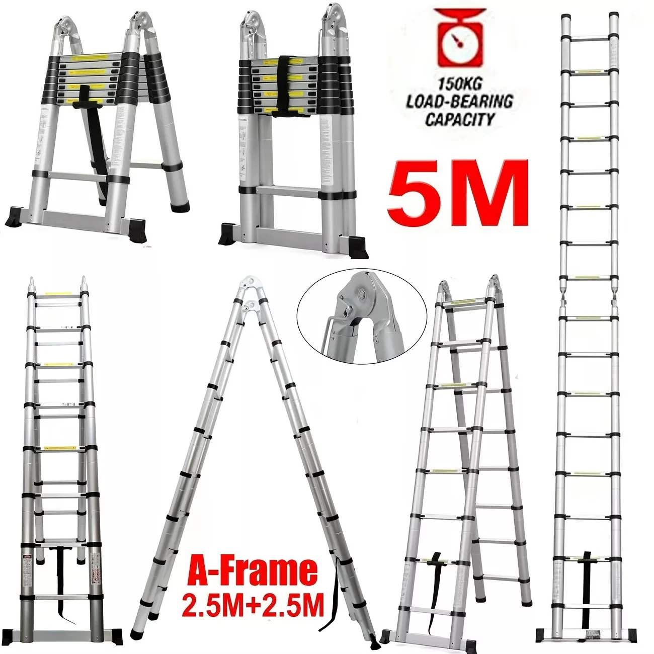 Échelle télescopique 5m (2,5+2,5) en acier inoxydable, portable, norme EN131, avec crochets détachables, capacité de charge 150kg