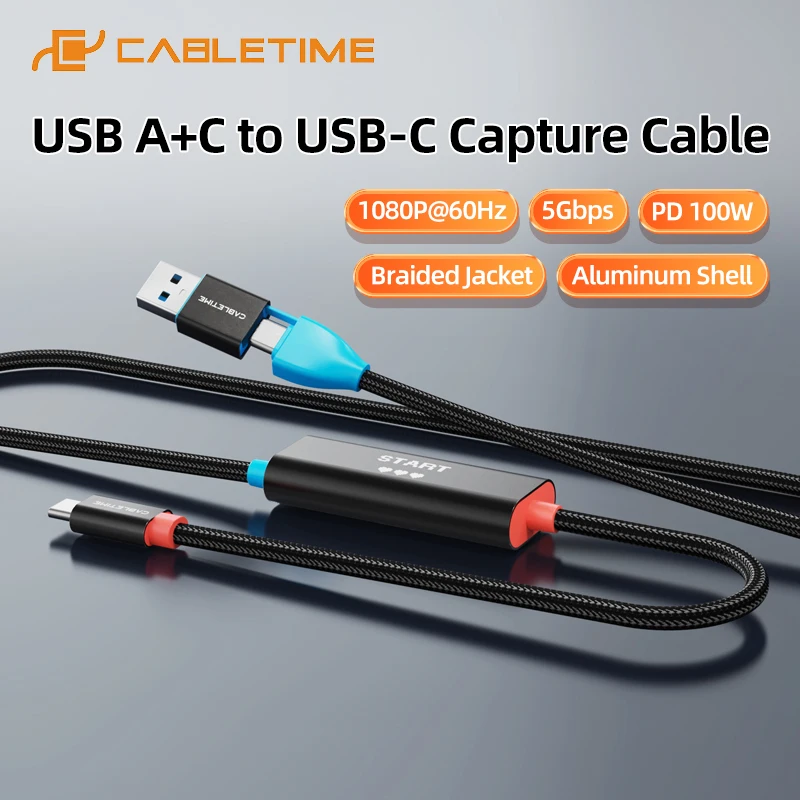 Câble de capture CABLETIME USB C/A 2 en 1 1080P@60Hz PD 100W 5Gbps Coque en aluminium pour tablette Ordinateur portable Commutateur 2/1 Capture vidéo