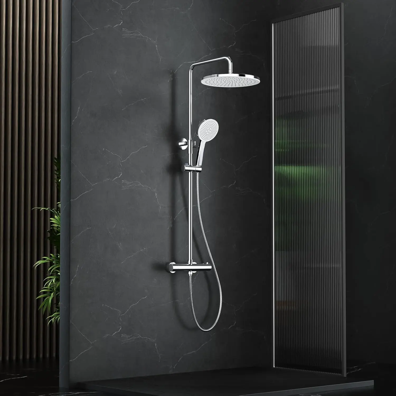 Système de douche thermostatique chromé, ensemble complet avec douchette pluie ronde de 30 cm et 5 types de jets, hauteur réglable 92-126 cm